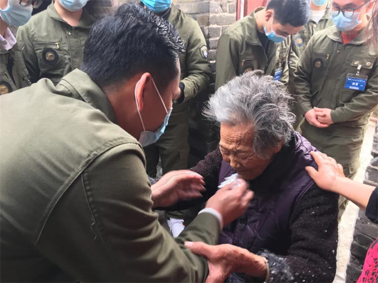 ▲突擊隊的武一為婆婆擦眼淚。婆婆有3個女兒1個兒子,可是她卻只有一個人住在一間已經破敗不堪的小房子里,里面?zhèn)鱽黻囮嚨膼撼簟K^發(fā)很長,腿有撞傷流血而未清除的淤血。她一直對我們說感謝,動情處熱淚凝眶,見者無不動容!與物質相比,更多的老人家們更需要的是親人,子女的陪伴和關愛!一直崇尚以孝為先的社會,原來依然有那么多不為人知的“隱秘的角落”!