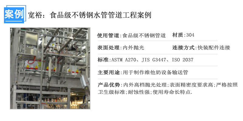 而這次寬裕的合作伙伴佛山維他奶也是采用寬裕衛生級不銹鋼管,衛生級(食品級)不銹鋼管在制藥、食品、啤酒、飲用水、生物工程、化學工程、空氣凈化、航空、核工業 等國民經濟建設多領域多行業上廣泛地應用,每年有大量的進口。這里介紹本廠生產衛生級(食品級)不銹鋼管的工藝與設備、管的性能與質量。