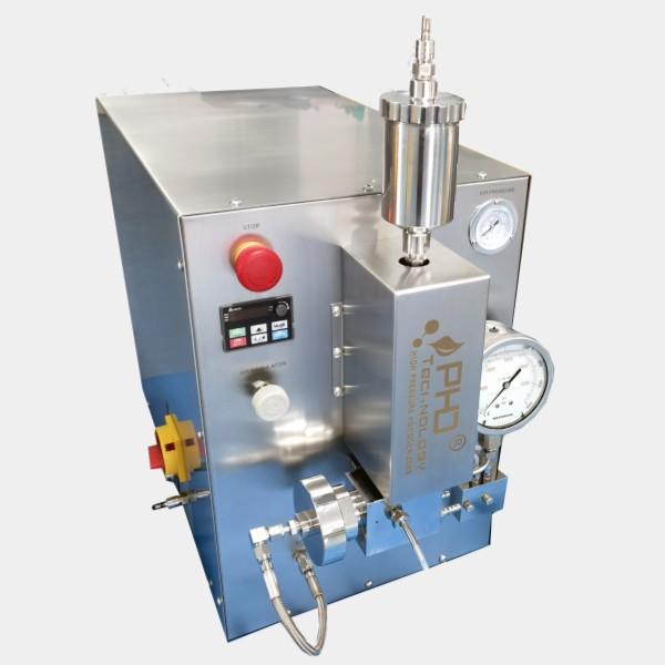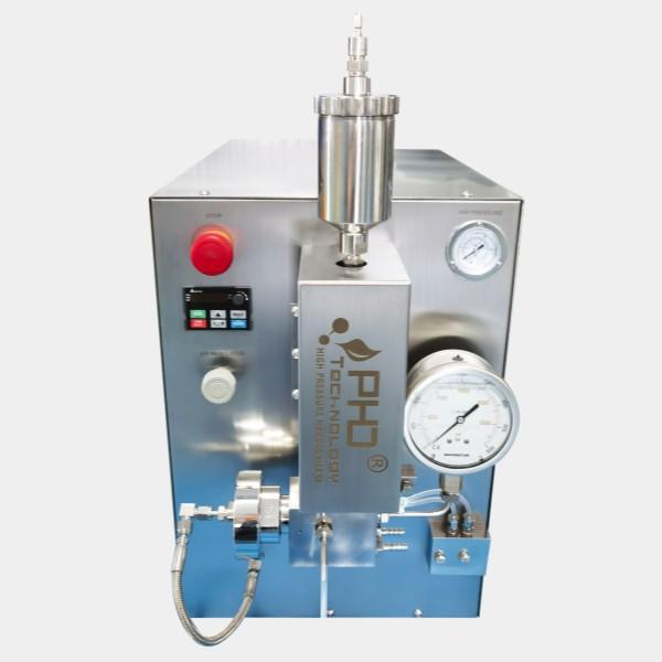 由電源(110V/220V/380V, 60/50 Hz) 驅動PhD高壓均質機的一個或者多個泵柱塞做往復運動,物料在柱塞作用下進入可調節壓力大小的閥組中經過特定寬度的限流縫隙均質區,瞬間失壓的物料以極高的流速(1000-1500米/秒)噴出,在均質閥內產生三種效應:空穴效應、撞擊效應、剪切效應。經過這三種效應相互作用處理過后,物料粒徑可均勻細化到100nm以下,細胞破碎率大于97%。